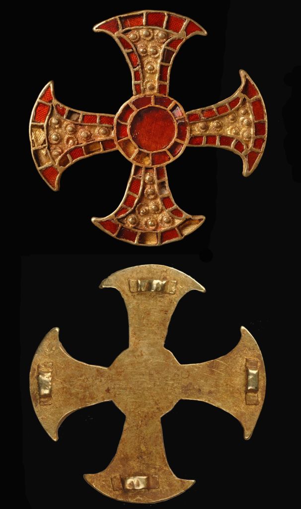 A beautifully crafted gold-and-garnet pendant, found on the chest of a richly buried young woman, its equal-armed form and central boss unmistakably recall Mediterranean Christian models.